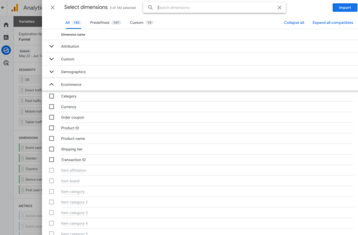 Dimensions are data attributes that we’ll use to break down the steps in the user journey. You could think of them as additional custom filters for the funnel. To add dimensions, click the Plus button beside the category to open the window for additional options and to find the events you want to follow. Specifically for our needs, we want to add those custom events we created as dimensions. For our identified segment (users from zip codes who visited in the last 7 days), we want to see how many made a purchase and then see how that funnel narrows and why.